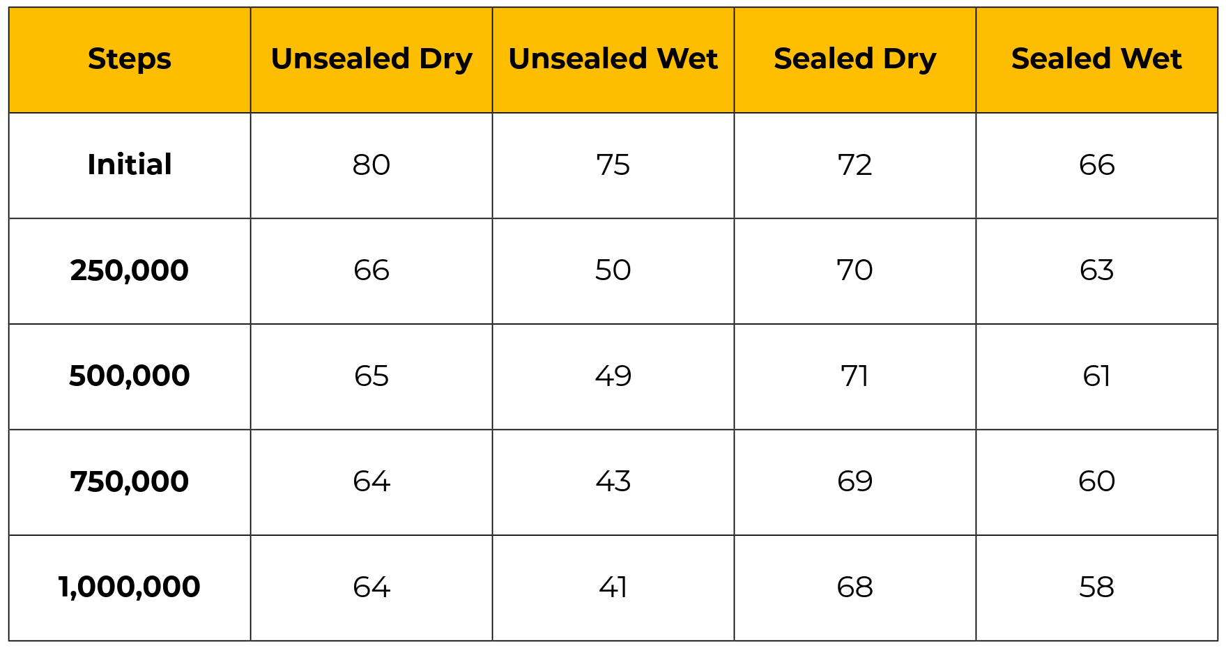 PA-Traction coatings demonstrated excellent long-term slip resistance, maintaining values well above the HSE minimum threshold even after extensive mechanical wear. These findings confirm the product’s suitability for high-traffic pedestrian environments, in both wet and dry conditions.